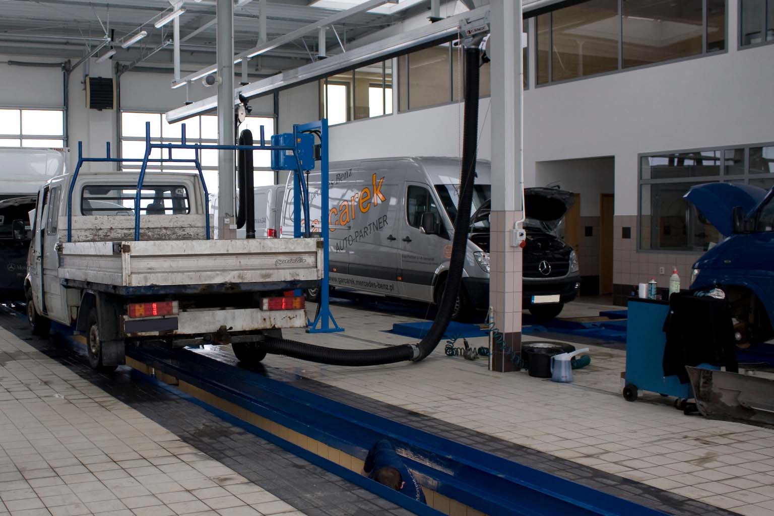 Stanowiska naprawcze zostały wyposażone w podnośniki kanałowe o udźwigu 14,5 tony z napędem pneumatycznym. W obiekcie została zamontowana instalacja dystrybucji olejów oraz odbioru zużytego oleju. Linia diagnostyczna MAHA została poddana przeglądowi, następnie przeniesiona do nowego obiektu. Na stanowiskach do obsługi pojazdów dostawczych zamontowane zostały dwa podnośniki dwukolumnowe APAC o udźwigu 3 tony. Obiekt posiada również na wyposażeniu wiele urządzeń do obsługi ogumienia, klimatyzacji i inne.