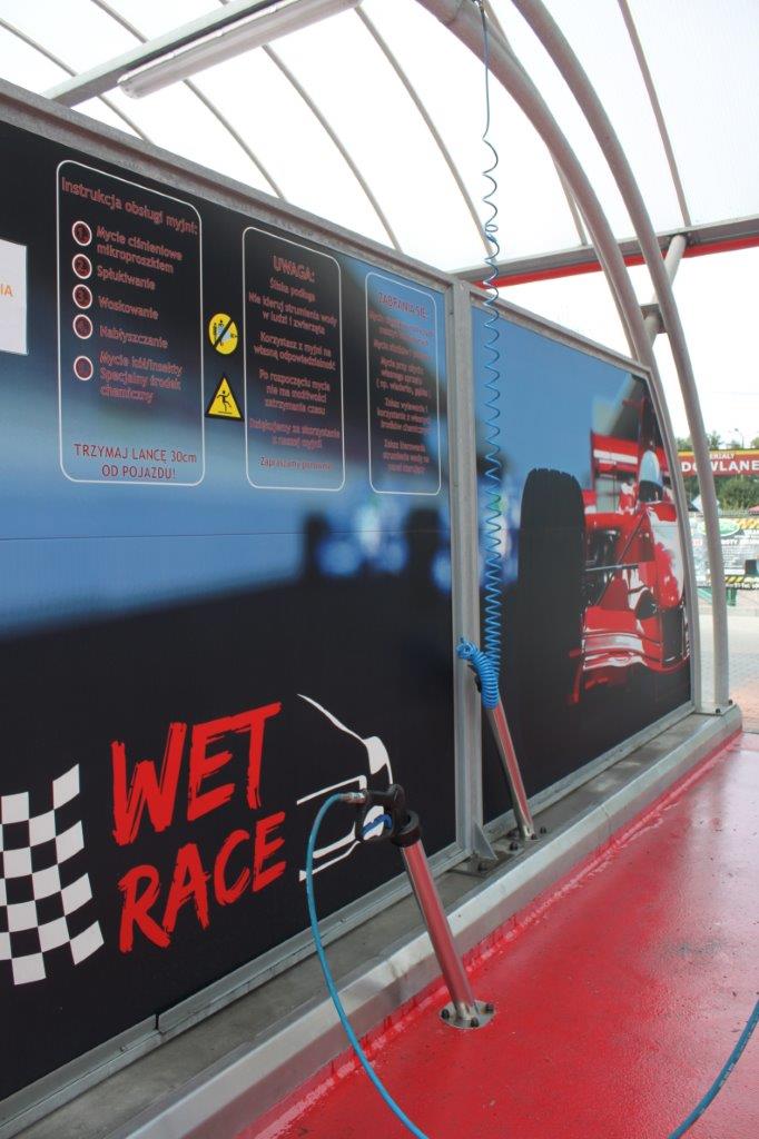 Myjnia wybrana przez inwestora posiada atrakcyjną wizualnie wiatę Sferica, która swoim nietypowym wyglądem przyciąga uwagę klientów. Dodatkowo panele rozdzielające stanowiska myjni zostały oklejone w sposób nawiązujący do wyścigów samochodowych Formuły 1. Całość tworzy ciekawą kombinację i dodaje urządzeniu dynamiki.